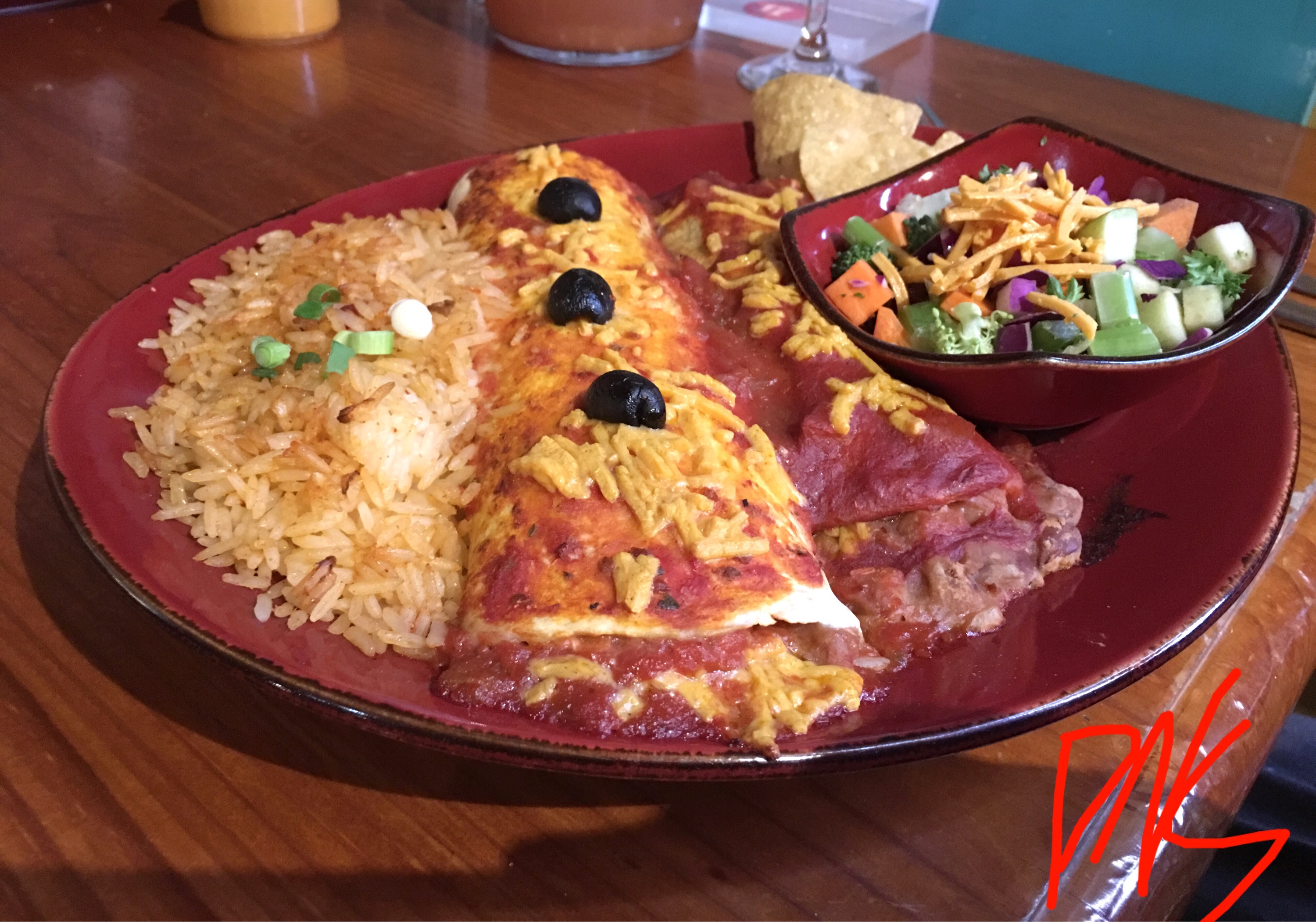 For our mains, it was recommended to us (by the ever helpful staff) to get the Vera Cruz combination meal (menu item #29). This included a bean burrito, a cheese enchilada (vegans will have a bean enchilada with cheese on top), salad and rice. Our meal arrived literally fresh from the oven, with a warning not to touch the plate until it had cooled slightly.